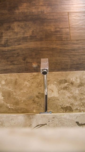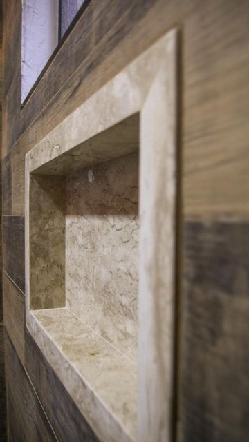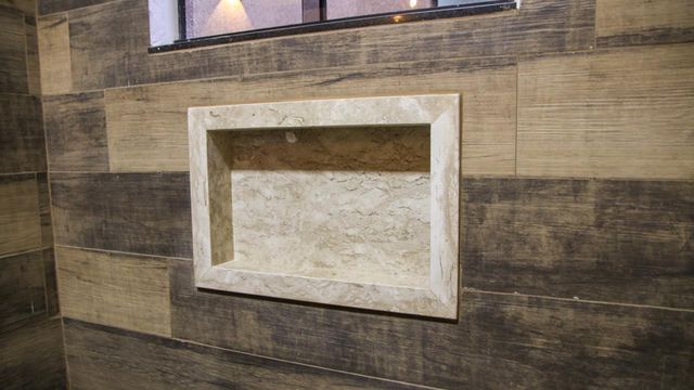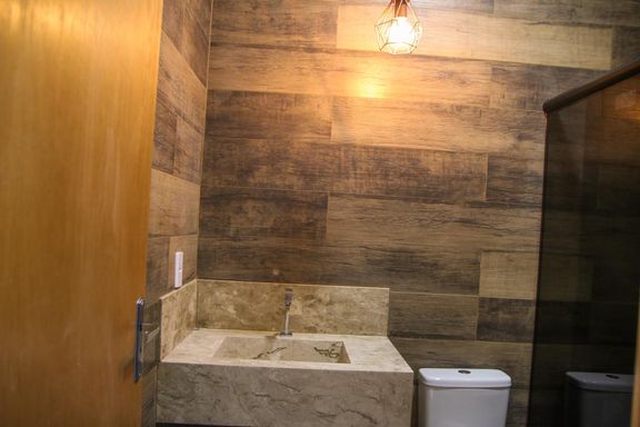 Banheiros com nichos, blindex fumê, lustres e cerâmica amadeirada