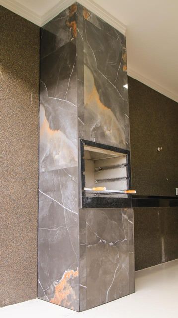 Área gourmet com churrasqueira, pia inox, bancada e porcelanato líquido
