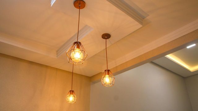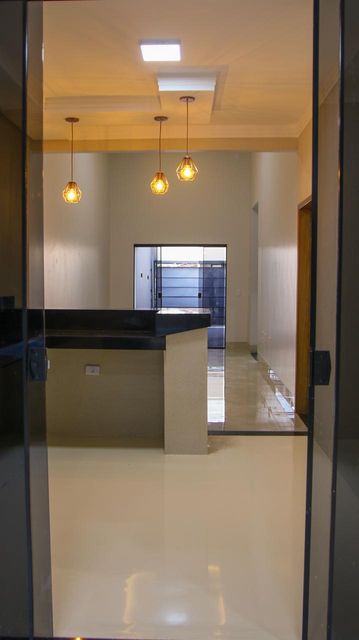 Cozinha com bancada, lustres e porcelanato líquido